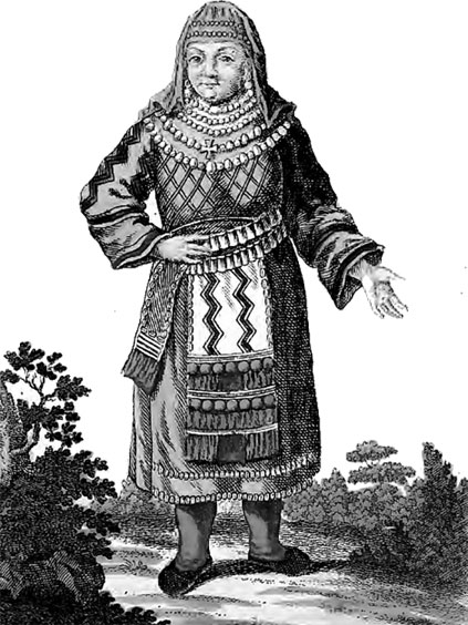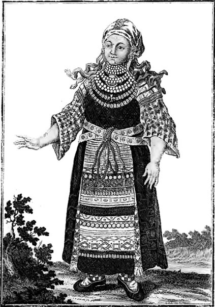 Финка в праздничной одежде. Иллюстрация из книги И. Г. Георги «Описание всех обитающих в Российском государстве народов». СПб., 1799 г.