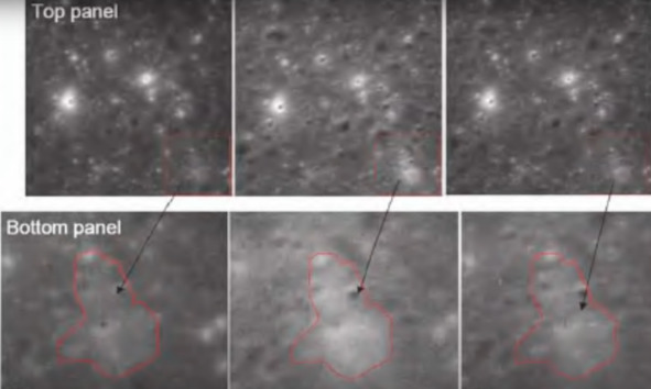 Американский пропагандист сослался на партнеров НАСА из Индии, которые тоже продемонстрировали серую американскую «Луну». Но они не смогли определить, есть ли следы обуви «космонавтов» НАСА на «лунной» поверхности. Индийские слуги США начали было лепетать, что несимметричный светлый район, это место где разлеталась лунная пыль от «прилунения». Но потом этот жалкий детский лепет почему-то прекратился. Скептики без особого труда наглядно показали, что это пятно необычной формы просто след от освещения. Все это продемонстрировано тремя снимками в общем кадре.