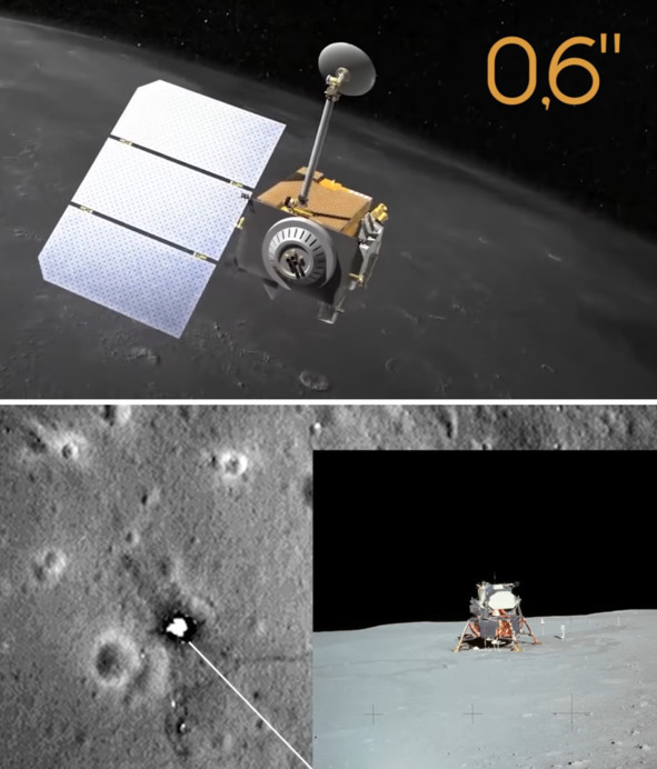 Выше представлен этот кадр из фильма американского пропагандиста «просветителя». В нижнем ряду изображений пятно кардинально меняется по форме и степени освещенности. Автор указал, что на этих кадрах разрешение– на 1 пиксель приходится 10 метров. Увидеть следы клоунов США невозможно. Автор при этом почему-то не стал повторять ложь о том, что выделенная область индийскими соратниками НАСА является следствием разлета грунта. На самом деле эта область таких следов не имеет. Далее, как обычно, защитник НАСА начал ссылаться на фотографии американских фальсификаторов нового поколения, сделанные, якобы, при помощи фотоаппаратуры АМС СШ «LRO». На 1 пиксель приходится, со слов пропагандиста 0, 3 м.