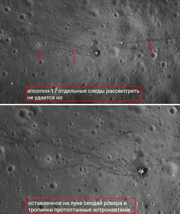 Сами американские обманщики называли величину 0, 5 метра. Толщина обуви американских клоунов НАСА была меньше 0,3 метра. Разлета грунта и устойчивых тропинок эти клоуны не прокладывали, согласно лунной мифологии. Это означает, что увидеть следы клоунов на американской «Луне» невозможно. Но, тем не менее, тропинки клоунов были обнаружены.