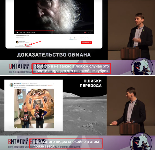 Выше представлен скрин-кадр этого ролика на страничке автор. [4] Защитники НАСА не брезгуют подделками и подтасовками, чтобы доказать американскую ложь. Кто изготовил фальшивый кадр с русским словом «Юмор», которое, якобы поместил Мюррей под своим роликом неизвестно. Можно только догадываться, что подделку создали соратники Виталия или он сам. Фальшивку сделали достоянием гласности и объявили ее признанием автора о том, что он просто пошутил.