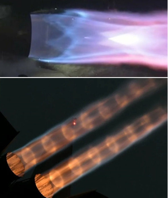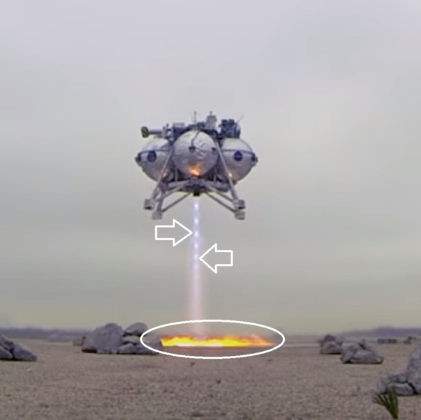 Выше на кадрах американского фильма показан факел американского двигателя, который был установлен на аппарате «Morpheus». [5] До того, как он сгорел, аппарат называли прототипом нового посадочного модуля NASA. Не трудно разглядеть зону повышенной температуры и давления, которое возникает при посадке аппарата у поверхности Земли. Видно, что пламя факела имеет своеобразные «узлы», «полосы», «окружности». В них температура и давление газа значительно больше, чем в других участках плазменного образования.