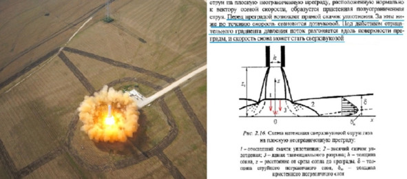 Поток газа разгоняется вдоль поверхности преграды, и его скорость становится выше скорости звука. Учебники 7 и 6 класса средней школы эти сведения ученикам не предоставляют. Сидоренко читал не те книги, которые бы позволил ему сделать правильный расчет. Многие полагают, что в вакууме факел уходит и рассеивается в стороны. Нет, факел в вакууме увеличивается и в длину. Все эти «ударные волны» в виде «лучей» и «узлов» присутствуют. Они действуют на грунт точно так же, как отбойный молоток, дробят самые твердые породы. На космодромах железобетонные плиты часто разрушаются под воздействием реактивной струи двигателей даже в очень глубокой яме.