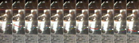 Аноним и Попов А. И. не заметили очень интересный момент в кадрах видео ролика НАСА, где «космонавт» прыгает перед флагом. На этих кадрах хорошо видно, что с подошв сапог лунного актера сыпется рыхлый грунт. Это означает, что на месте прыжка не могло остаться чёткого отпечатка обуви. Но на фотографии этого момента, прыжка актера в скафандре, а возможно, и подвешенного на струне манекена, куклы, хорошо видны четкие отпечатки обуви. Съемки ролика НАСА и фотография прыжка были сделаны в разное время, и, вероятно, в разных местах. Без вариантов, четкий отпечаток невозможен, если при прыжке прыгуна, с подошв его сапог сыпется большое количество рыхлого грунта. Четкий отпечаток оставить невозможно.