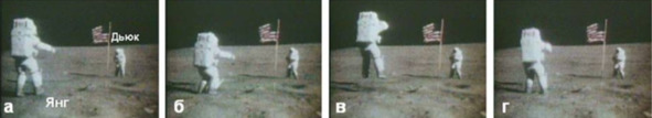 Автор: «Илл.7. Астронавт Янг демонстрирует вполне земной прыжок в высоту. а) разбег, б) группировка, в) максимальная высота прыжка, г) прыжок окончен. Конечно, в условиях лунного притяжения хочется прыгать вверх. Свободные прыжки с сохранением контроля за движением возможны до одного метра. Прыжки на большую высоту часто заканчивались падением. Наибольшая высота прыжка составляла два метра, т. е. до третьей ступени лестницы лунной кабины. В этом случае космонавту удалось сохранить равновесие только потому, что он сумел схватиться за лестницу руками». Два метра – такое значение высоты прыжка на Луне для астронавта, одетого в скафандр, хорошо согласуется с простыми расчётами. Познакомимся, однако, с тем, какие видеоматериалы представила НАСА на эту тему. Известен видеоклип, показывающий два демонстрационных прыжка астронавта в высоту: астронавт Джон Янг прыгает в высоту с места в присутствии коллеги Чарльза Дьюка. Подразумевается, что всё это снимается на автоматическую камеру. В обеих попытках астронавт подпрыгивает вверх на примерно одинаковую высоту. На илл.7 показано несколько кадров из этого клипа“. „Никомо“ не затронул и этот аргумент: „На илл. 9а показан ещё один прыжок астронавта Янга, который очень часто фигурирует в самых разнообразных публикациях про полёты «на Луну». Надо сказать, что на сайте НАСА правильно называет реальную высоту этого прыжка – 42 см. Но немногие дотошные читатели найдут эту информацию, вот и гуляет легенда о высоком прыжке Янга. «Высоко подпрыгнув над Луной, астронавт Янг салютует флагу». [2] Прыжок был совсем невысоким, земным.
