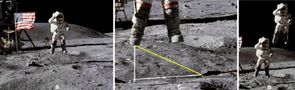 Автор наглядно показал проблему мифологии НАСА: «Илл.9. Ещё один прыжок астронавта Янга. а) «Высоко подпрыгнув над Луной, астронавт Янг салютует флагу» – Г. Бурба, б) увеличенный фрагмент, показывающий истинную высоту прыжка, в) вот так выглядел бы прыжок в высоту на 2 м. На самом деле, зрительное ощущение «высокого» прыжка Янга – умело сконструированная иллюзия. Разобраться в этом поможет увеличенный фрагмент снимка (илл. 9б). Сзади астронавта – небольшой холмик, с которого, судя по отпечаткам башмаков, он и прыгнул. Перед холмиком – маленькая ложбинка, над которой завис астронавт. Такой микрорельеф создаёт впечатление большой высоты прыжка. Оценить реальную высоту прыжка поможет построенный треугольник 1-2-3, состоящий из гипотенузы 1—2, соединяющей башмак астронавта и его тень на грунте, и двух катетов 2—3 и 3—1. Легко видеть, что расстояние от подошв прыгнувшего Янга до грунта не превышает расстоянию от подошвы до сгиба колена, то есть опять оно не более 50 см.