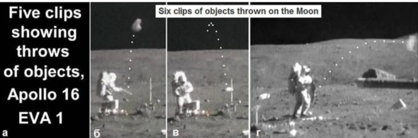 А, как справедливо отмечают авторы, ни в одной из лунных экспедиций не запечатлён наглядно такой простой и одновременно эффектный опыт, как высокое подбрасывание предметов. По адресу можно найти шесть коротких клипов, на которых астронавты А-16, якобы находящиеся на Луне, время от времени отшвыривают какие-то предметы. Бросков, даже отдалённо напоминающих названные 100 м, там нет. Все броски на несколько метров в высоту. Вы сможете на Земле подбросить мягкую тряпку или лёгкую картонку на 3—4м в высоту? Уверен, что да. Так на каком основании нас хотят убедить, что бросание предметов, запечатлённое в этих шести клипах, происходит на Луне? Правда, темп бросков замедлен, но замедлить или убыстрить действие – вполне в силах кино». [2]