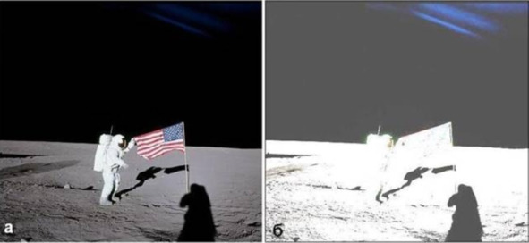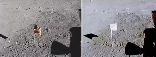 И вот что странно: все детали на обоих снимках совпадают, кроме одной – тень от полотнища флага на илл. 1а уходит влево, а на илл. 1б вправо. Почему? Ведь и во время съемки снимка «а», и во время съемки снимка «б», снаружи модуля никого не было. Тогда кто развернул полотнище флага в случае «б»?» [1] Действительно положение полотнища флага заметно изменилось. Такой факт оспаривать невозможно. Но защитники НАСА не привыкли отступать перед такими трудностями. «Никомо» предложил несколько вариантов объяснений.