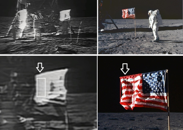Автор книги о Лунном обмане заметил одну любопытную особенность изображения флага на двух разных «лунных» снимках. Эту тему аноним решил тоже исследовать и опровергнуть утверждение автора: В главе 12 стр.141 А. И. Попов пишет: На илл. 1а показан снимок, согласно НАСА, сделанный астронавтами А-11 через окно лунного модуля после завершения их единственного выхода на поверхность Луны. На илл. 16 мы видим тот же самый сюжет, но уже как кадр из фильма.
