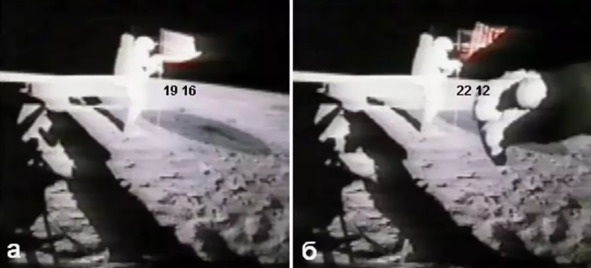 Что касается темы флага США на американской «Луне», то в этой теме встречается очень много интересных сцен. Попов А.И и Мухин Ю.И понимали отличие колебаний от колыхания флага. Это отметил автор книги: «Эпизоды с развевающимся «лунным» флагом на ветру обсуждались настолько часто, что уже успели, наверное, «набить оскомину» и скептикам, и защитникам. Но не коснуться совсем этих эпизодов мы не можем. Факт есть факт, и при комплексном рассмотрении его игнорировать нельзя. Перед Вами два кадра из клипа НАСА, в котором показано, как астронавты А-14 устанавливают флаг (илл.3). Немного более полно этот же эпизод показан в фильме.