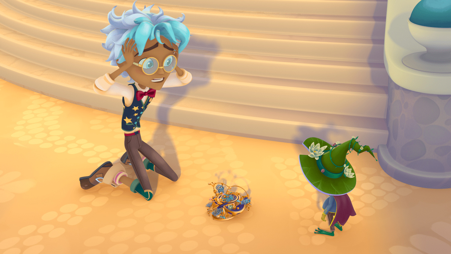 Звездочёт и Астер стали перетягивать Волшебный Компас. Звездочёт тянул его к себе, Астер тоже не сдавался. Артефакт выскользнул из их рук, упал и разбился на мелкие осколки. Все вокруг ахнули.