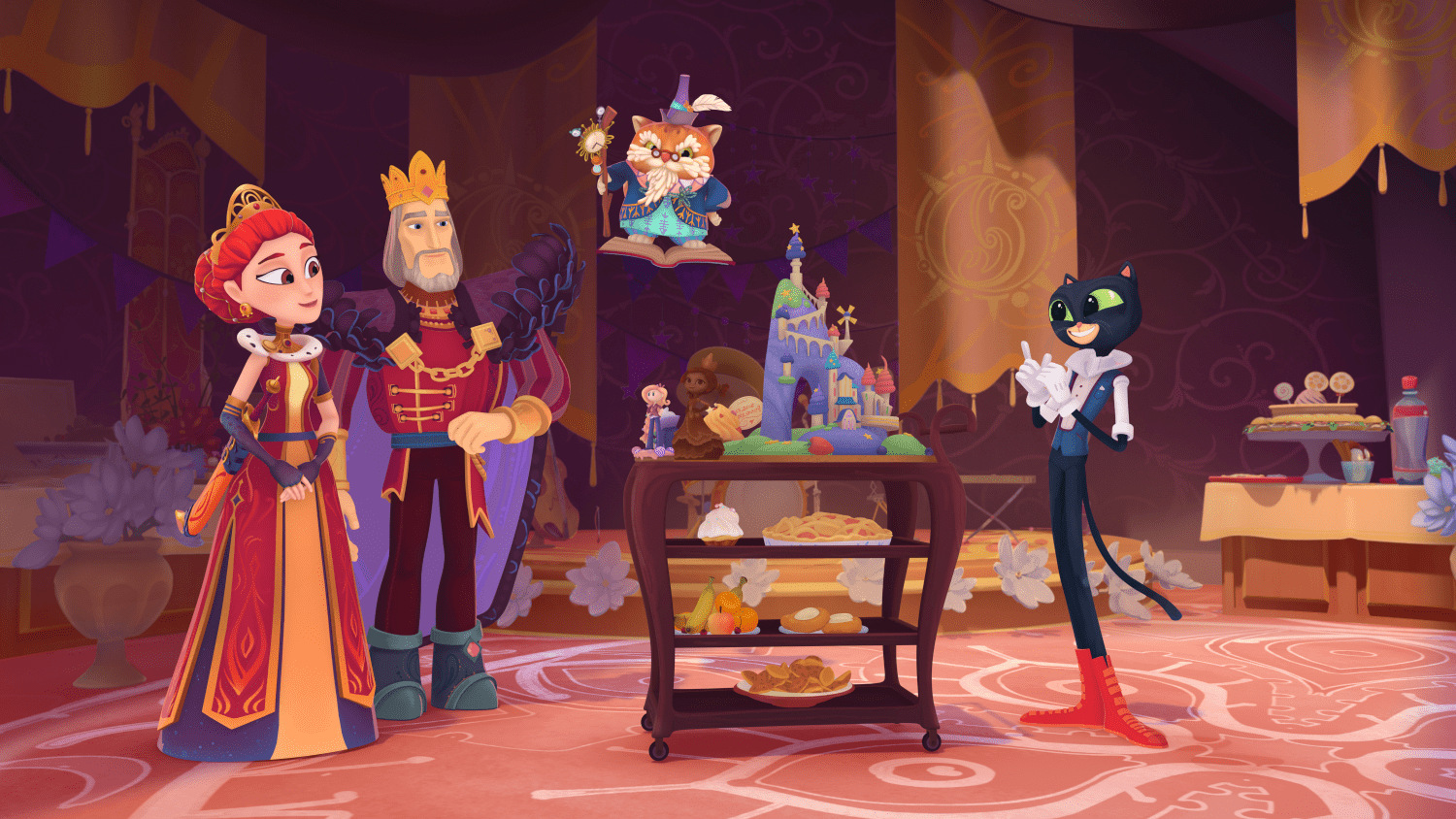 К Королю и Королеве подскочил Кот Учёный, кативший перед собой тележку со сладостями.