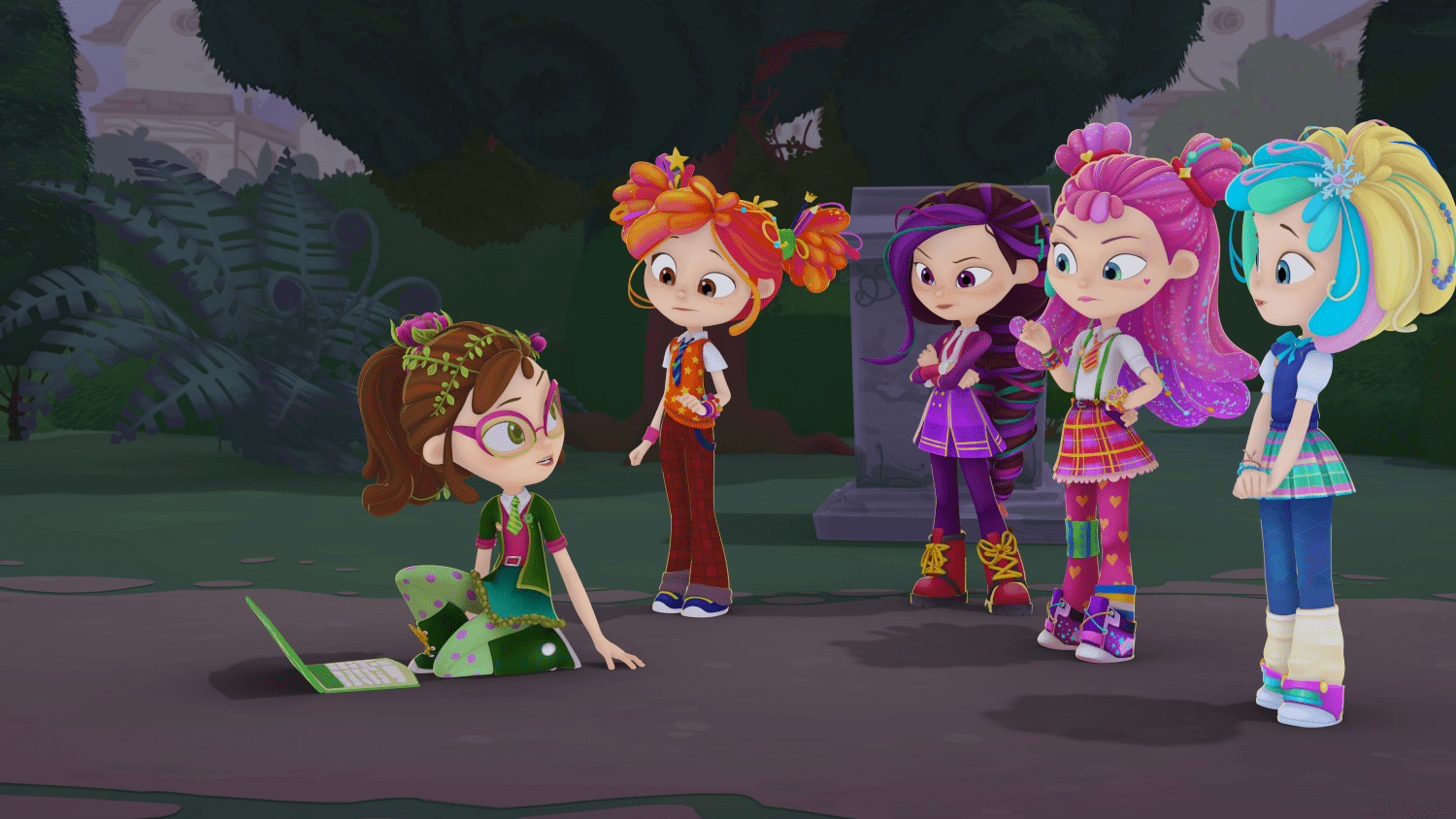 Монстрику стало жарко носиться по помещениям, и он выскочил во двор. Там на бортике фонтана спокойно сидел Корвин и увлечённо читал. А волшебницы Сказочного патруля совсем выбились из сил. Что же делать?