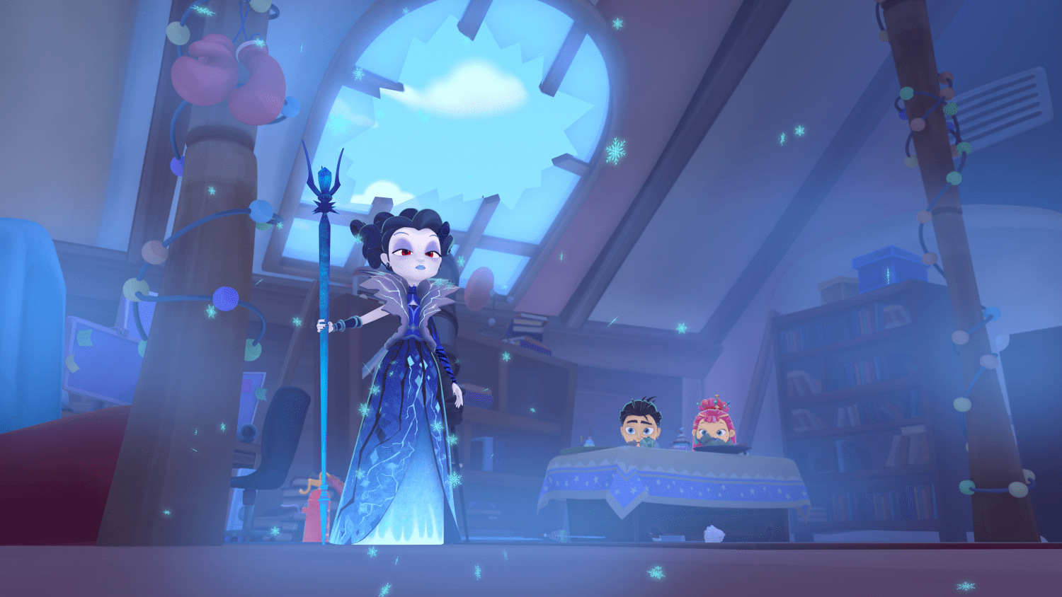 Вдруг в замке Снежной Королевы стало происходить что-то странное. Королева закончила разговор по видеосвязи – и, резко замерев, уставилась в пространство. Глаза Королевы стали красными, а черты лица заострились. Это была уже не добрая тётушка… Она холодно посмотрела на пол, на котором валялись игрушки её сына:
