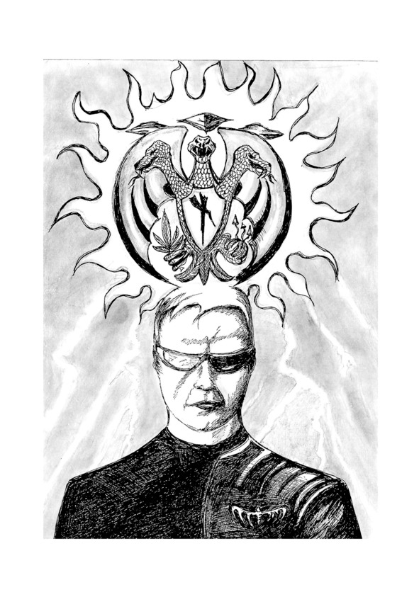 И увидел я сияющего золотом Трехглавого Орла. И Щит Серебряный был на чешуйчатой груди Его. А на Щите светящийся Косой Крест «Т». В одной лапе он сжимал когтями Пучок Грибов, в другой – Лист Мэри Джейн, Траву Дьявола…