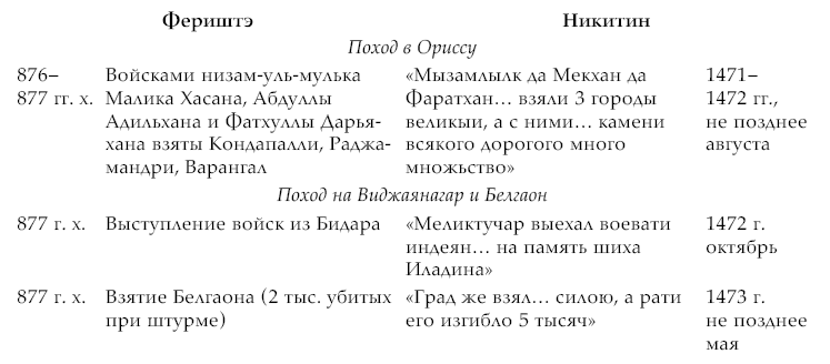 Сопоставимые данные хроники Фериштэ и записок Никитина о войнах на Декане можно представить в следующем виде[1459]1459