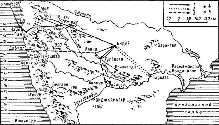 1 – маршрут 1471 г.; 2 – маршрут 1472 г.; 3 – маршрут 1473–1474 гг.; 4 – города, которые посетил А. Никитин; 5 – города, описанные им по рассказам