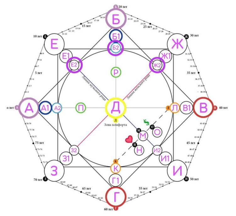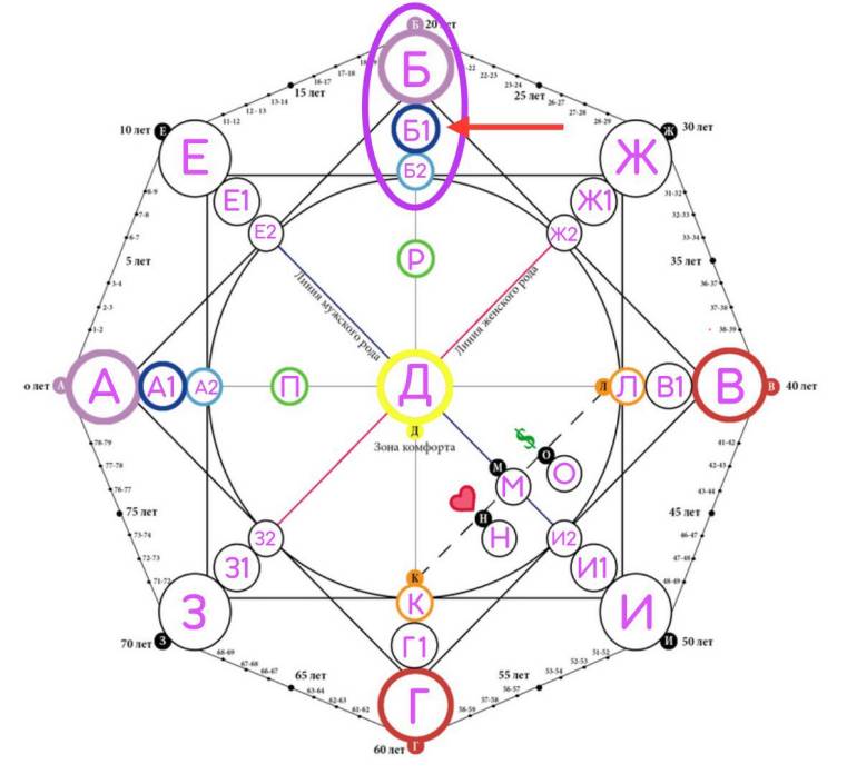 Точка Ж2 – талант рода матери, наработанный предками и переданный человеку для раскрытия своего собственного таланта (точка Б2)