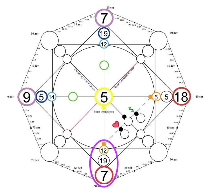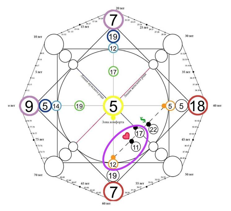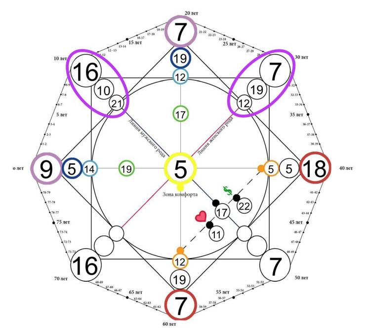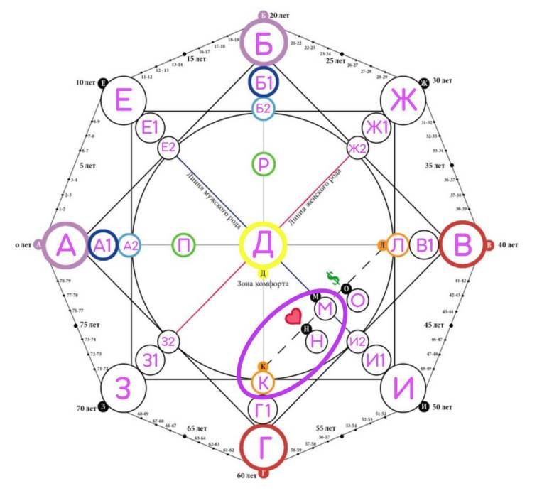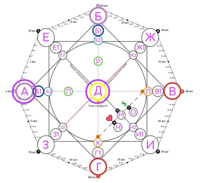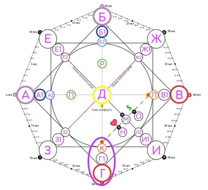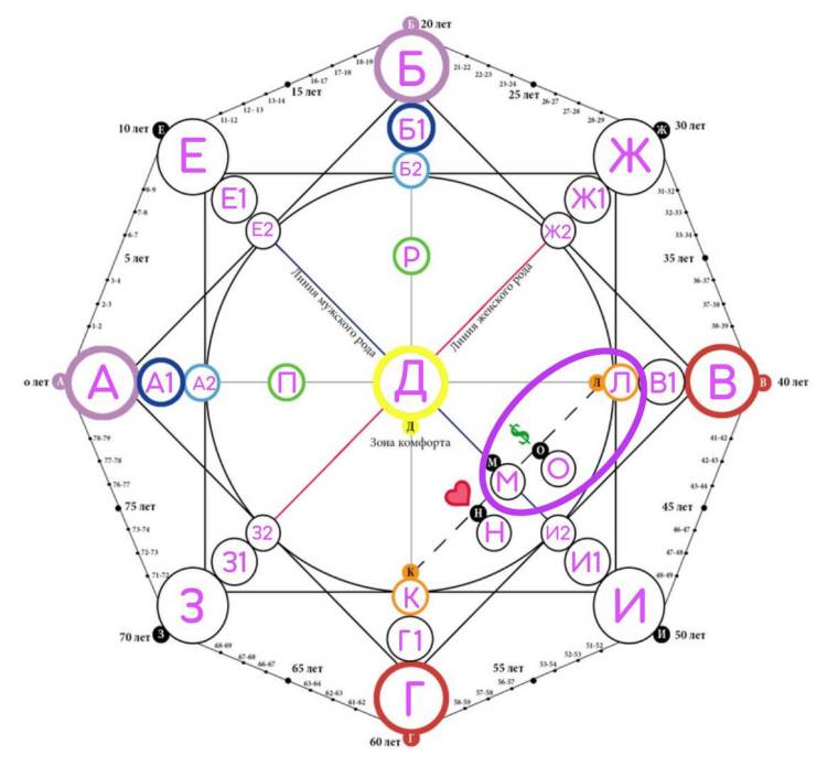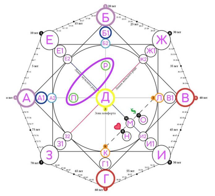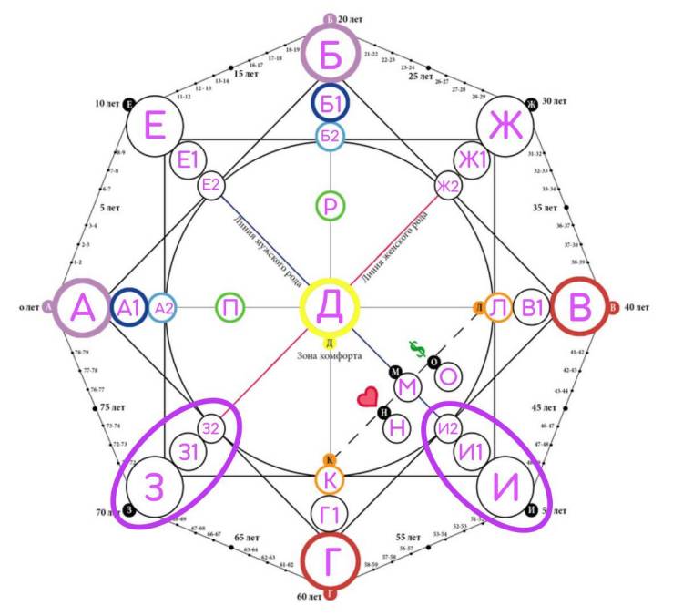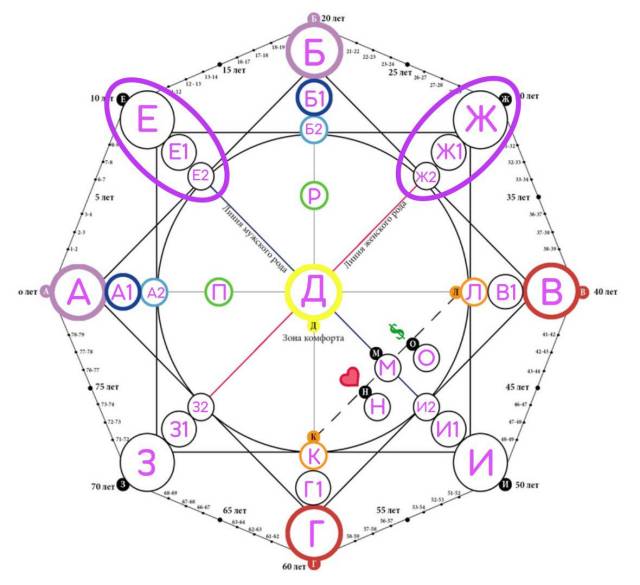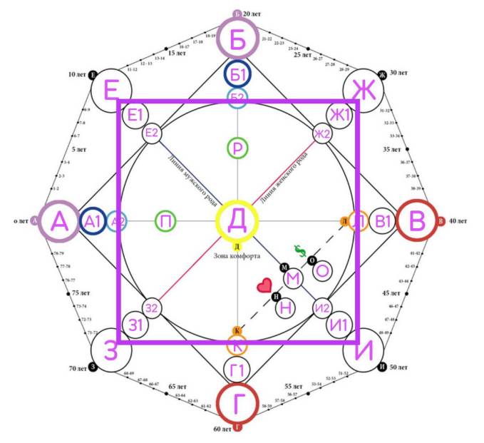 Второй квадрат (прямой, на рисунке выделен фиолетовым цветом), который состоит из вершин ЕЖИЗ называется родовым квадратом. Он включает в себя ключевые характеристики, которые переданы человеку от предков по линии мужского и женского рода (отца и матери)