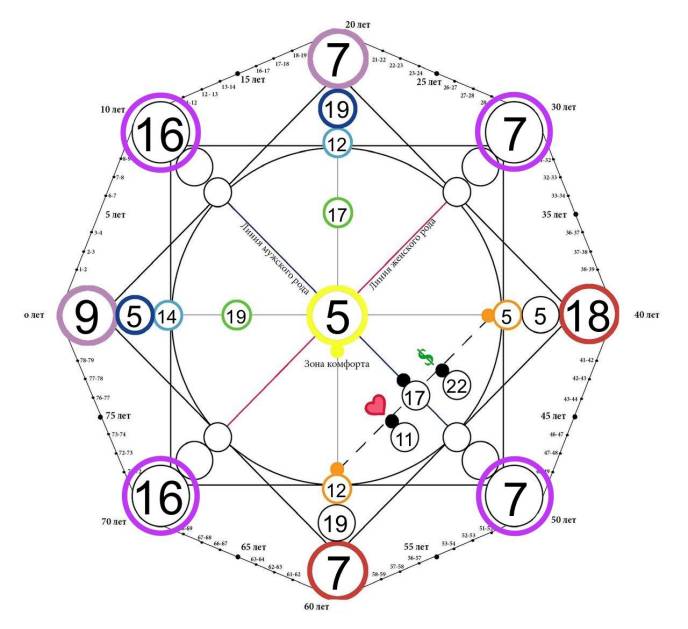 Точка М – эта позиция расскажет о том, как финансовая реализация может влиять на отношения внутри семьи и наоборот – как отношения повлияют на способность успешно реализоваться финансово. Через эту точку можно узнать, на что обратить внимание для достижения успеха и благополучия внутри семьи и в карьере.