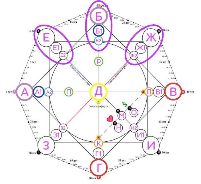 Точка Ж2 – талант рода матери, наработанный предками и переданный человеку для раскрытия своего собственного таланта (точка Б2)