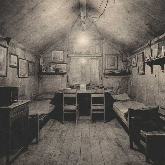 Я вошел в мою «камеру заключения». Комната имела около тридцати квадратных метров, высота же едва ли достигала четырех метров. Стены были покрыты фанерой. Одна лампочка на потолке, другая на письменном столе. Две узкие кровати у стен и несколько простых стульев.