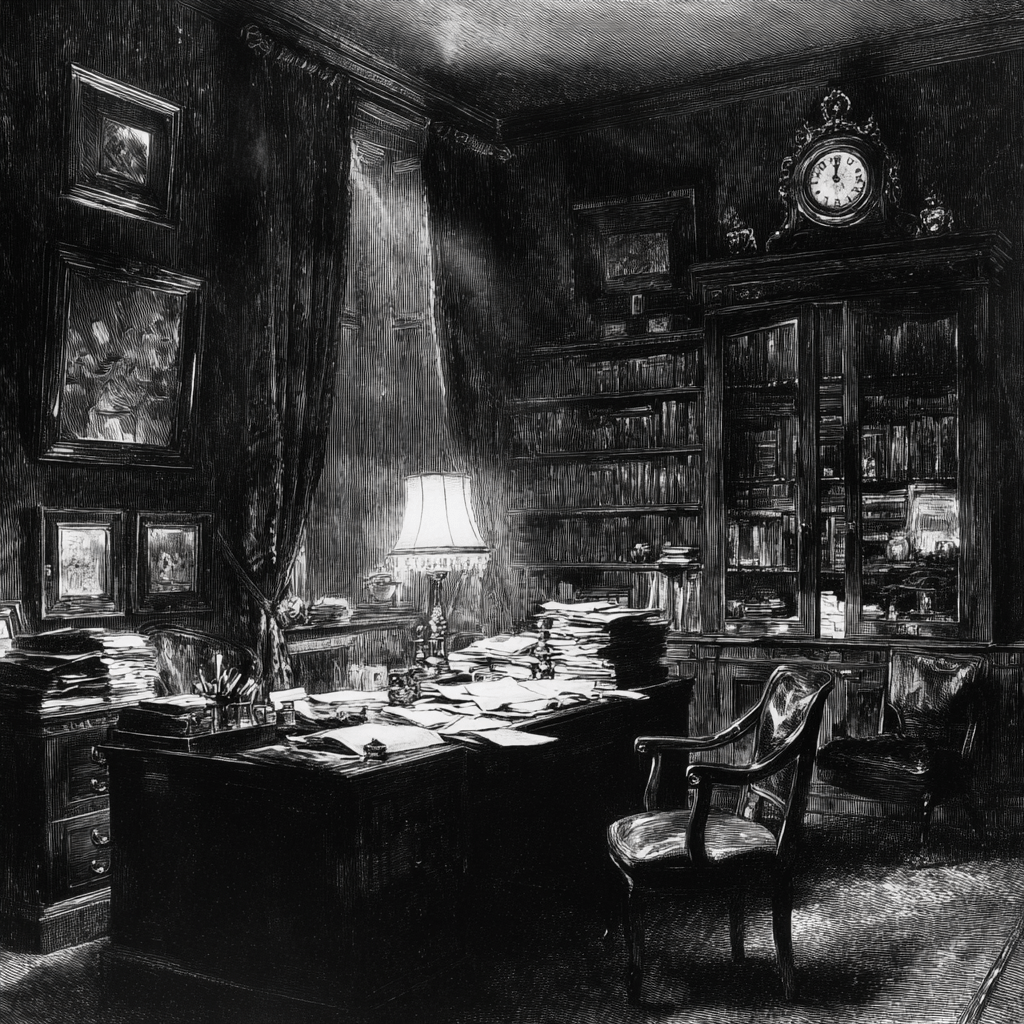 Какая мрачная комната! Но заниматься здесь хорошо: ничто не отвлекает внимания. Лампа с глухим абажуром освещает только письменный стол, заваленный книгами, рукописями, корректурными оттисками. Глаз едва различает солидную мебель черного дуба. Темные обои, темные драпри. В полумраке поблескивает только золото тисненых переплетов в тяжелых шкафах. Длинный маятник старинных стенных часов движется размеренно и плавно.