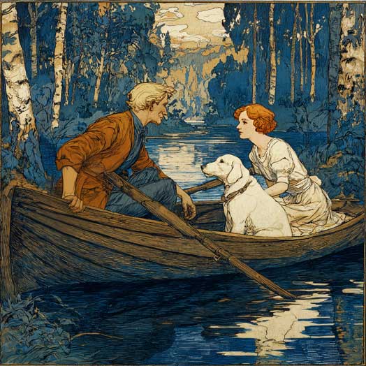 Лодка быстро поплыла вниз по течению. Солнце скрылось за лесом. Вверху река сверкала, как расплавленное золото, вокруг лодки легли уже синие тени. Потянуло сыростью. Эмма накинула на плечи пушистый платок.