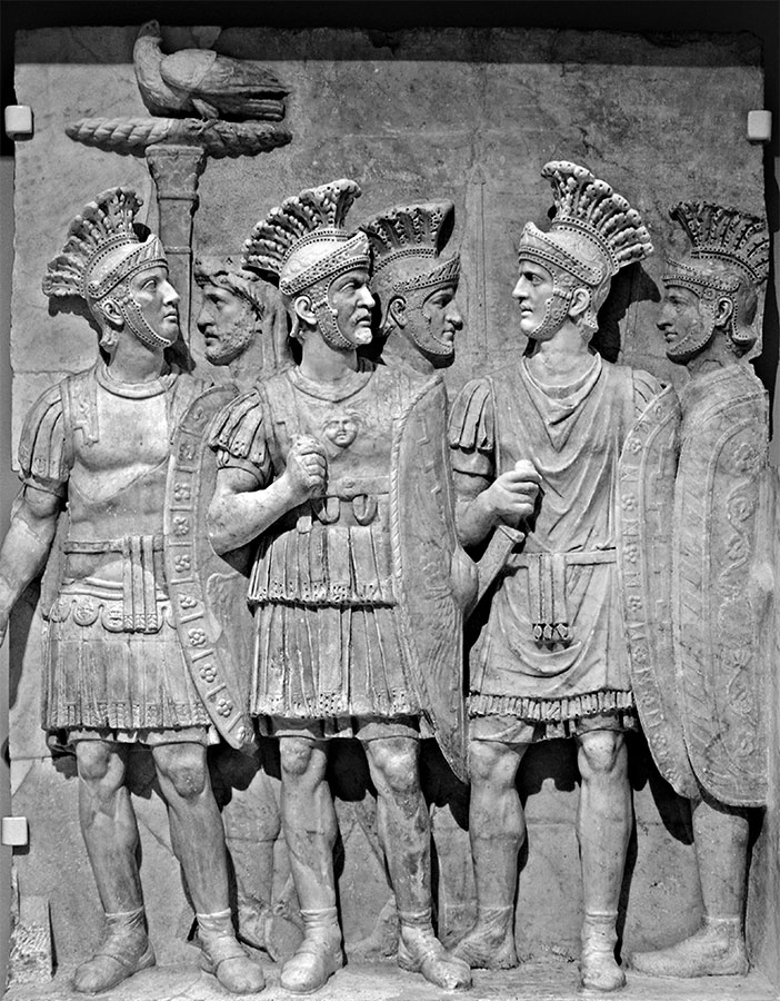 Рис. 3. Шесть преторианцев на рельефе арки Клавдия, возведенной в честь покорения Британии. Благодаря преторианцам Клавдий стал императором. Рим, 51–52 гг.