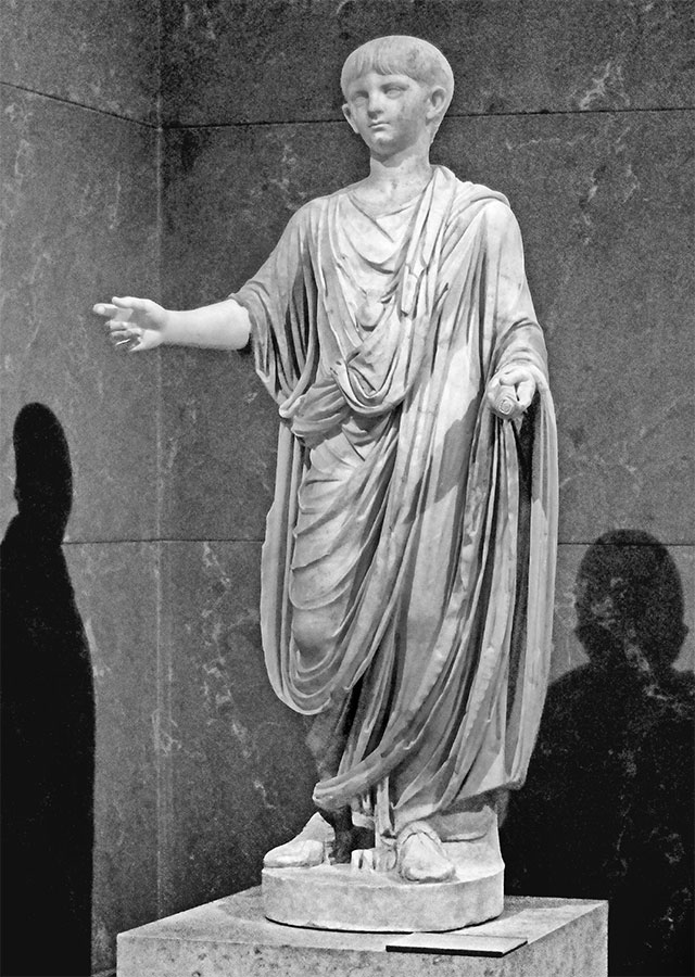 Рис. 5. Нерон примерно в 12-летнем возрасте. Вероятно, статуя была создана по случаю усыновления Нерона Клавдием в 50 году. На шее Нерона булла – оберег, который должен защитить ребенка от магии и порчи. Мрамор, 49–51 гг.