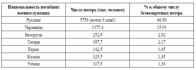 Вот сравнительный анализ (не полный, только лишь начальными строками!) гибели военнослужащих разных национальностей в ВОВ 1941–1945 годов.