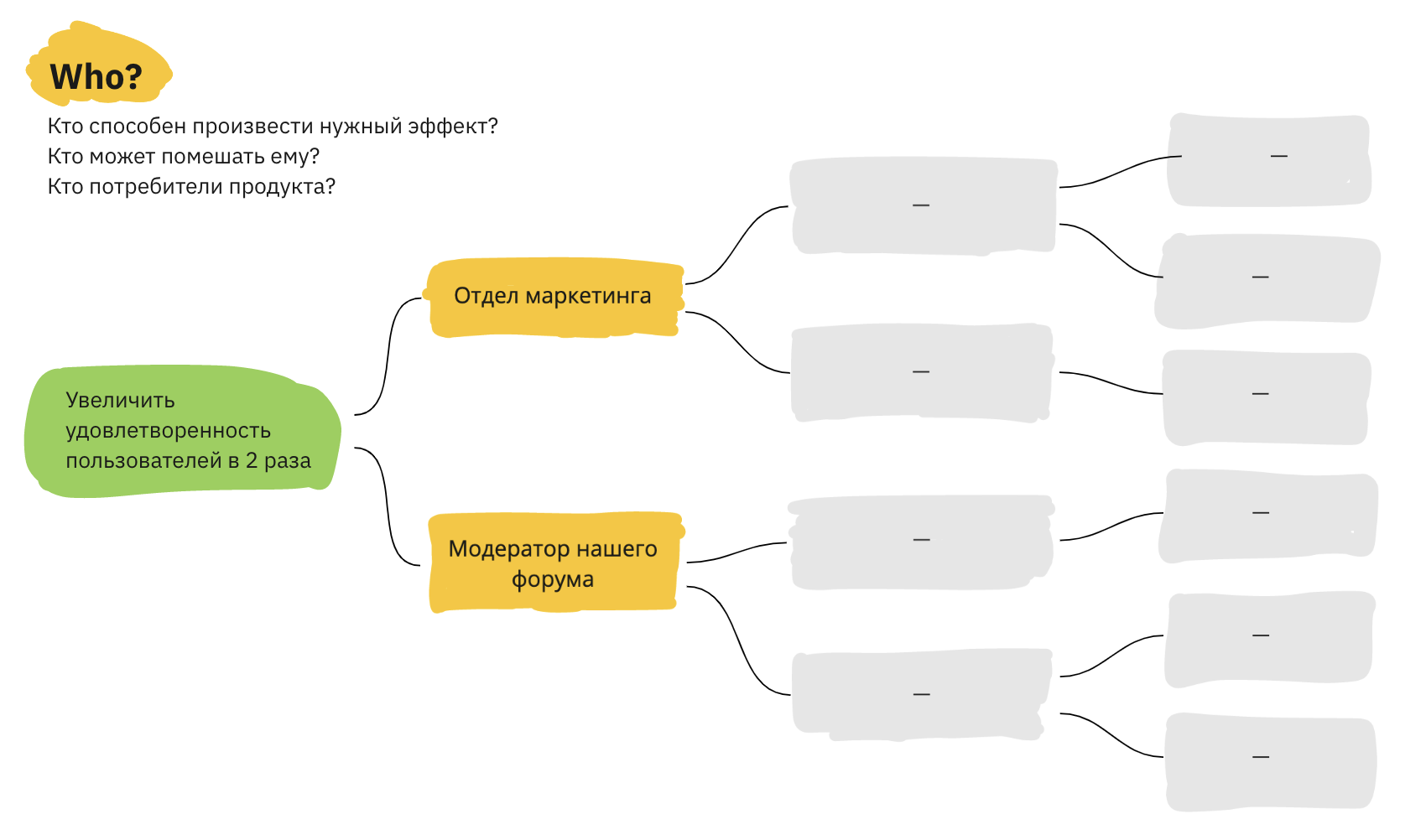 На этом этапе мы должны выявить всех, кто поможет оказать влияние на цель, кто поспособствует её достижению или помешает. В нашем примере это будут Отдел маркетинга и Модератор форума. По мнению заказчика, именно они могут изменить удовлетворённость пользователей (рис. 7).