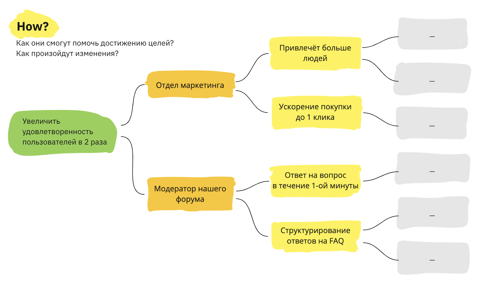 На втором уровне нужно описать действия заинтересованных сторон для достижения целей. Мы ищем ответ на вопросы: Как они помогут бизнесу достичь целей? Как они могут помешать успеху продукта?