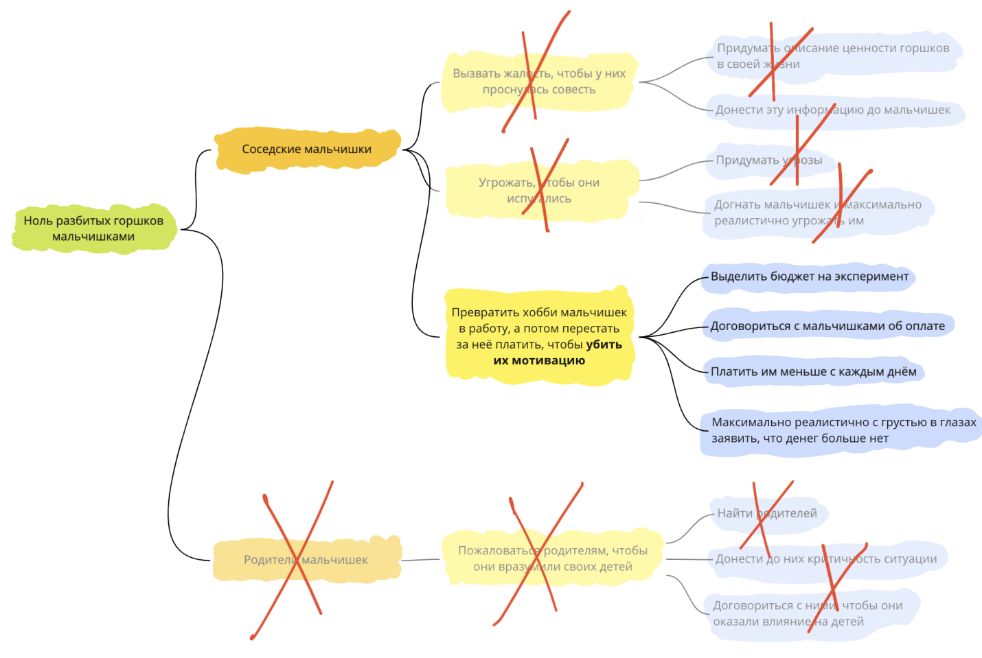 Моя формулировка идеи звучит так: «Превратить хобби мальчишек в работу, а потом перестать за неё платить, чтобы убить их мотивацию». Здесь описано, что хочет сделать гончар и на чем основывается его надежда на достижение результата. Он надеется сильно снизить мотивацию мальчишек бить его горшки. Похоже, что он отличный психолог!