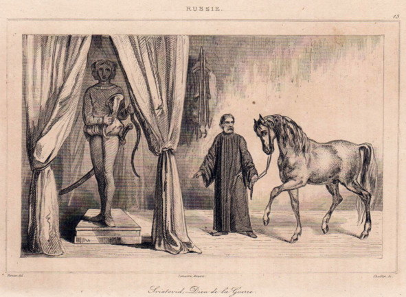 В томе, посвященном России, между 73 и 74 страницами, я нашел очень интересную иллюстрацию славянского бога Святовита и человека, который преподносит ему в дар коня22