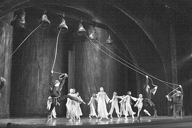 От повисшей под колосниками звонницы тянутся колокольные веревки, с которыми весь спектакль неразлучна эта шестерка персонажей – Звонари, и весь их танец, исполненный мужественной виртуозности, проходит под аккомпанемент сплетающихся над головами канатов, символического образа нитей времени и нитей истории, собрать воедино которые и попытается в финале царь Иван IV Васильевич Грозный. Звонари – не просто удачная находка хореографа. Звонари – своеобразный символ исторического времени, ударами колоколов отмеряющие его неотвратимый ход, сгибающиеся под его нелегким бременем и выносящие свой – высший – приговор деяниям и поступкам отдельной личности. Они открывают спектакль, одетые в красные рубашки, черные трико и красные сапоги; в концентрированно-сгущенном освещении сцены – тоже красном – их танец оборачивается метафорой медленно разгорающегося пламени. После взмахов рук – колокольных призывов в общей статичной группе, расположенной в центре площадки, – Звонари размеренно расходятся в стороны. Движения рук передаются всему телу, и, подчиняясь единому ритму, они «раскачиваются», «прикованные» к ушедшей в небеса звоннице, словно бы сзывая героев на площадь-арену, где предстоит разыграться трагедии. Пластическая мелодия постепенно нарастает. Звонари, подобно огненным лучам, разлетаются от центра и вновь возвращаются к начальной точке, на кульминации темы хореограф вводит в их пластику прыжок (револьтад), исполняемый одновременно всей шестеркой персонажей, и многократное повторение этого прыжка вносит в действие неистово ликующую, напряженную интонацию, рождая целый ассоциативный образный ряд, связанный со временем великих московских пожаров, кровавых казней, немилосердных расправ и вместе с тем раздольно торжественными гуляниями, ибо красный цвет в древности являлся символом праздника. Звонари возникнут в спектакле и перед сценой битвы, теперь уже во всем черном, они предстанут выражением бедствия, горя и скорби: тут неверен шаг и тяжела колокольная ноша, движения как бы направлены вниз, к земле, и канаты над головой натягиваются в суровом ожидании, как паруса во время бури. Эта «морская» ассоциация вовсе не случайна здесь, ибо тема «окияна – моря синего», присутствуя в музыке Прокофьева (не в данном, правда, эпизоде), проходит опосредованно в спектакле – и через льющийся в прозрачной и спокойной величавости хоровод девушек («Смотрины») и в пластическом образе Звонарей, словно бы влекущих корабль Российской империи на просторы времени и истории, Звонарей, чья пластика рождает именно это романтическое ощущение, выражавшее кроме всего прочего и извечную народную мечту о выходе России к морю. Звонари возникнут на сцене и в эпизоде возвращения воинов, предстанут теперь безмятежными скоморохами (во всем белом), а после отравления Анастасии появятся в уже знакомом нам скорбном – черном – одеянии, предвещая неистовую молитву-монолог Ивана и таинственно-величавое, торжественное шествие черных монахов, под смиренными рясами которых окажутся блестящие опричные кольчуги. И, наконец, в последний раз Звонари выбегут на сцену в финале спектакля… Жанровую конструкцию балета можно определить как лиро-эпическую. На первый взгляд спектакль походит на историческую хронику, но ее эпизоды скреплены логикой авторского в