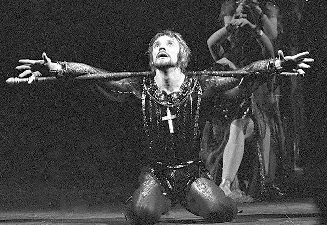 И Грозного – царя и полководца, прогрессивного деятеля и тирана. Этот Грозный увиден и показан словно бы с позиции Звонарей, олицетворяющих исторический суд и одновременно суд автора – его объективную оценку. В этой двойственности проявляется нравственная позиция спектакля и формируется его нравственный пафос, рожденный желанием художника отойти от предвзятости, миновать любое спекулятивное решение темы. Хореограф воспринимает образ, отделенный от нас четырьмя столетиями, исторически. И по известной закономерности исторического процесса этот образ предстает перед нами как легендарный или «мифологический». Грозный – герой завершенной и ушедшей эпохи – понят и осмыслен как герой средневекового русского эпоса. И, думается, хореограф был справедлив в таком восприятии Грозного, чей образ уже давно существует – независимо от исторических исследований – в качестве образа литературного. Иван Грозный после танца Звонарей, выхода народа, марша распри бояр на высоком постаменте, скрытом поначалу за центральным нефом декорационной установки, высвечивается фигура Грозного. Он возникает в момент всеобщей сутолоки и суеты. Он сидит на троне, низко опустив голову и судорожно-напряженно опираясь на подлокотники престола. Тихо-вкрадчива музыка – марш молодого Ивана, и медленно, слишком медленно он поднимается среди наступившего вдруг оцепенения. Движения степенные, но плавность разрушают то неожиданно острый жест, то резкий ритмический поворот головы. Это появление Грозного тревожно и едва ли не фантастично. Он подобен зловещей тени. Но образ вместе с тем сразу задан исполнителем роли Ю. Владимировым в трагическом аспекте. Этот первый монолог у трона, около трона, на самом троне полон трагических предчувствий. Я бы назвал этот монолог осознанием себя царем, себя Грозным.