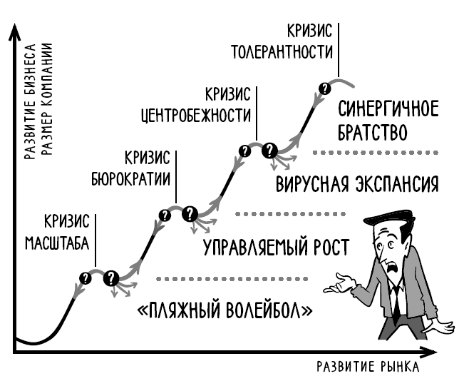 Названия этапов и кризисов отражают мое представление о сути происходящего. Во время семинаров я никогда не дискутирую о формулировках, а, наоборот, предлагаю участникам, которых что-то смущает, выбрать для себя другие названия, наиболее информативные с их точки зрения. А вот уже внутри каждой компании я рекомендую в определенный момент прийти к единой терминологии: важно, чтобы все руководители использовали единый «пакет чертежей» с возможностью его согласованного изменения.