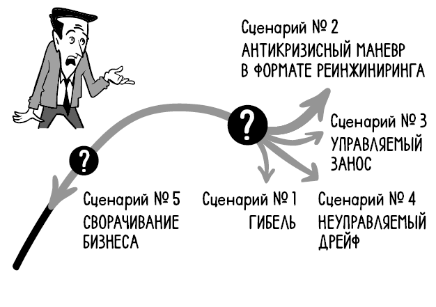 Сценарий №3: Управляемый занос. Этот сценарий достаточно редкий, но мне доводилось участвовать в его разработке и реализации. Его суть состоит в том, что компания весьма заблаговременно замечает симптомы, свидетельствующие о приближении кризиса, характерного для текущего этапа организационного развития, и по ряду причин этой компании важно суметь как можно дольше продолжать свою деятельность, ничего существенно не меняя в действующей системе корпоративного управления. Одновременно в компании осознаю´т, что чем дольше будет продолжаться ее деятельность, тем выше риск «сваливания в штопор» – сценария очень быстрого и радикально жесткого развития кризиса. В компании разрабатывают детальный комплексный план антикризисных преобразований с назначением ответственных за каждый проект. План подробнейшим образом не просто обсуждают, а разбирают, что называется, «по косточкам», добившись понимания и единомыслия в том, кто, что, как, когда и почему делает и как это увязано с общим планом. Обсуждают параметры рыночных факторов, критичных для успешной, в прежней конфигурации, работы компании. Определяют параметры, при которых нужно будет начинать антикризисные преобразования. Разрабатывают адекватные методы наблюдения. В нужный момент спокойно, эффективно, в рабочем режиме, успешно выполняют антикризисный маневр. Думаю, теперь вы понимаете, почему этот сценарий реализуется довольно редко: руководителей, знакомых с фундаментальными законами деятельности компании, очень мало; большинство, образно говоря, пытаются управлять мясорубкой изнутри, не покидая ее и не разбираясь в том, что собрали своими руками.