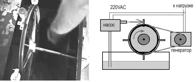 Производительность насоса около 350–600 литров воды в час. Мощность потребления примерно 1 киловатт в час. Расчет величины мощности, которую можно было бы получить от турбины, если полностью использовать кинетическую энергию такого потока воды (350 кг в час при давлении 100 атм), мы производить не будем. По экспериментальным данным, ее хватает для того, чтобы даже самодельная турбина, показанная на фото, и обычный электрогенератор работали в автономном режиме, обеспечивая электропитание насоса и нескольких ламп накаливания, выполняющих роль полезной нагрузки. По особенностям конструкции генератора Харди отметим, что его турбина с «ложками» вращается недостаточно быстро, чтобы обеспечить вращение электрогенератора с требуемыми 1500 оборотов в минуту. Поэтому на валу турбины установлен маховик большого диаметра для ременной передачи на вал генератора, который имеет меньший диаметр. Видеофильм данного эксперимента можно посмотреть в Интернет http://www.youtube.com/watch?v=qhwQt1tJYa8