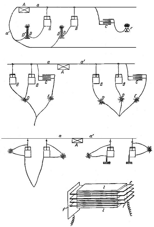 На рис. 52 показана схема распределения переменного тока с конденсаторами по французскому патенту Яблочкова, № 120684 от 11 октября 1877 года на «Систему распределения и усиления атмосферным электричеством токов, получаемых от одного источника тока с целью одновременного питания нескольких светильников».
