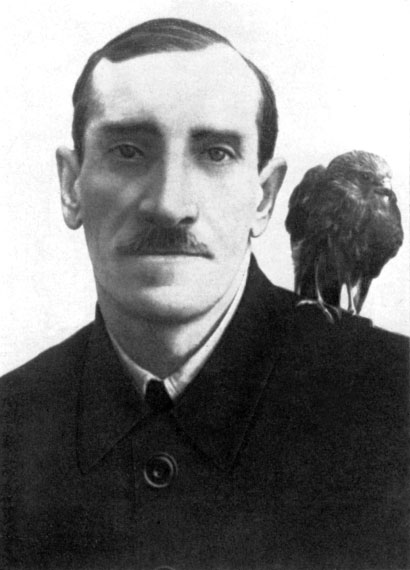 А.С. Грин с ястребом по кличке Гуль-гуль. «Сев… мне на левое плечо, Гуль заглянул мне в лицо с тем полным понимания выражением глаз, которое так восхищает нас у животных».