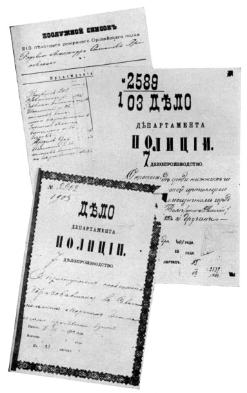Послужной список солдата Александра Гриневского и обложки двух дел департамента полиции о пропаганде среди войск Севастополя