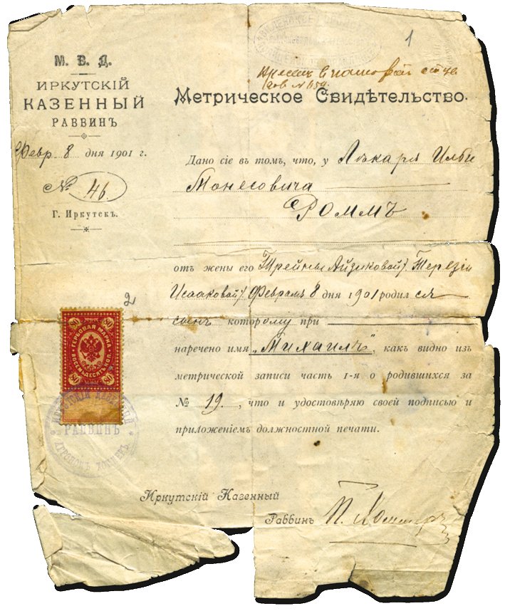 1901, 11 января (24 января н. ст.) – Михаил Ильич Ромм родился в Иркутске. Сюда за участие в революционной деятельности был сослан его отец.