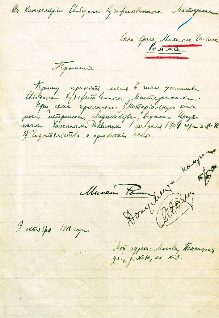 «Прошение» М. И. Ромма о зачислении в Свободные художественные мастерские