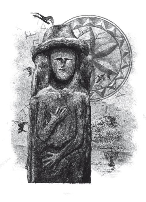 …А теперь пока поведаю о том, кто такой был Стриб и что у него была за семья. Этот поселившийся среди неспокойных туч бог мог принимать образ великана или карлы с огромными веками, которого сопровождала стая черных воронов. Стриб от рождения был почти слеп, не мог открыть глаза без посторонней помощи, но его взгляд проникал во все миры и нес смерть врагам. Лицом Стрибу служила железная маска. На ногах бог носил железные когти, которые сами надевались. С помощью этих когтей Стриб всегда мог забраться на высокую гору или небо[21]21
