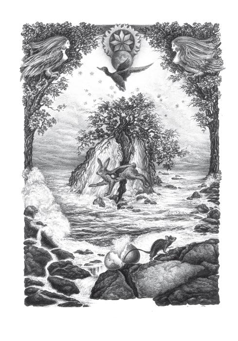Птицы летели, сколько было сил, пока не достигли незнакомой долины, где у хрустального ручья рос громадный ясень. Солнце, месяц и звезды были его сережками.