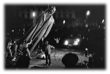 Пока снимал этот процесс на камеру, моей хрупкой жене удалось вытащить из самого пекла в качестве сувенира тяжеленный кусок плаща Дзержинского. Через несколько мгновений фигура покачнулась и под ликующие крики народа грохнулась наземь, чудом никого не придавив.