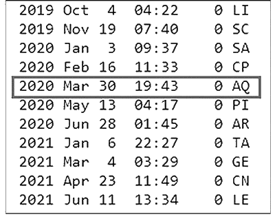 Рис. 30.1. Ингрессии Марса – фрагмент таблицы с сайта Astro.com