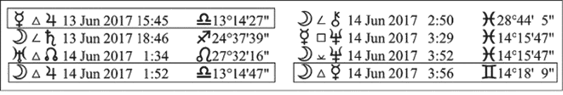 Иллюстрируют его эфемериды со склонениями на июль 2017 года из Приложения 11 и скан страницы аспектария из ежегодных эфемерид Рафаэля на июль 2017 года из Приложения 12.